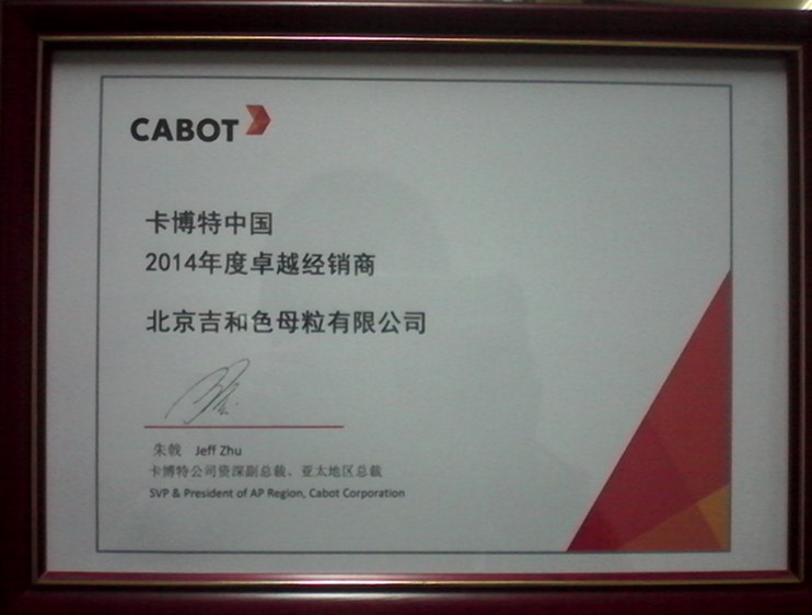 2015年11月12號,全球頂級色母料供應商卡博特公司在無錫召開大中華區經銷商代理會議,會議進行了三天,總結一年來卡博特產品在中國區的銷售情況,并布置2016年的銷售計劃,同時評選國內卡博特各代理商2015年的銷售情況,北京吉和色母料有限公司作為卡博特黑色母大中華大的代理商,聯系五年蟬聯卡博特卓越經銷商稱號,年銷售卡博特黑色母6000T。
