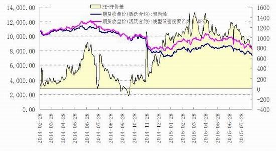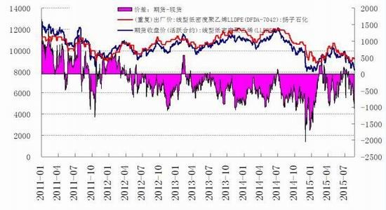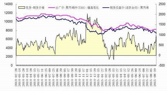 2、7月下旬受系統(tǒng)性風(fēng)險影響,連塑破位下行,7月24號華東現(xiàn)貨報價9300附近,期貨1509收盤價8835,期現(xiàn)價差一改前期期貨市場處于深度貼水的格局,回歸到合理范圍之內(nèi)。但在8月份,受線性轉(zhuǎn)產(chǎn)影響,現(xiàn)貨市場得到一定支持,但期貨市場再次下行,期現(xiàn)價差再次回到之前的800以上位置。同時受原油暴跌帶動,現(xiàn)貨難以維持強(qiáng)勢,按照市場經(jīng)驗,共振作用下,連塑的下跌趨勢和動能都將獲得增強(qiáng)。
