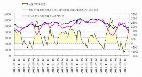 3、從生產(chǎn)成本上看,在原油持續(xù)低位徘徊的情況下,下游市場也難以走出一枝獨秀的行情,進(jìn)入8月份原本十分堅挺的亞洲乙烯和丙烯價格大幅下跌,導(dǎo)致了亞洲市場PE和PP直接生產(chǎn)成本下降,當(dāng)前線性與乙烯價差擴(kuò)大到2000以上的高峰,線性企業(yè)或許會加碼生產(chǎn)。